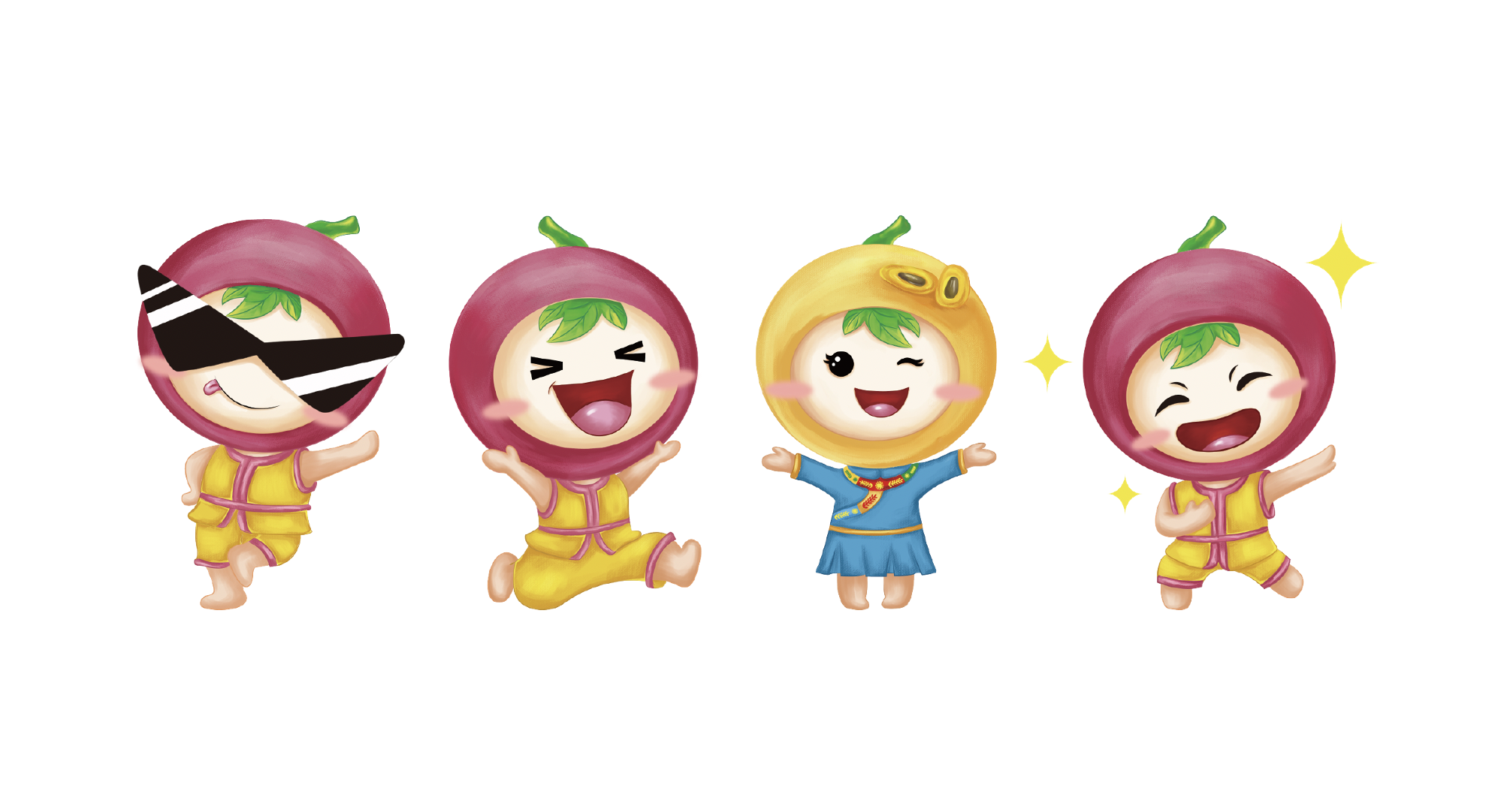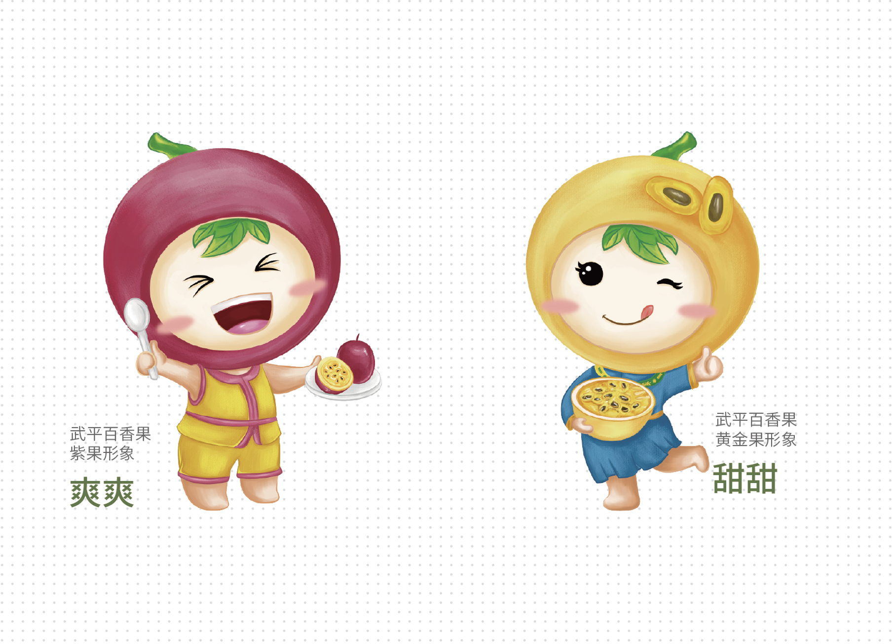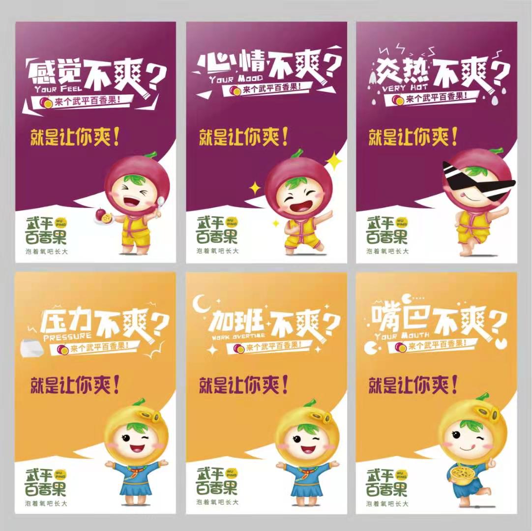 除此之外,弘道公司為了便于后期品牌價(jià)值和故事的演繹及其傳播,為武平百香果創(chuàng)造了輔助傳播的“代言物”形象,在代言物中我們充分植入了武平縣當(dāng)?shù)乜图椅幕?,把客家人的服裝元素進(jìn)行了生動(dòng)融合,在一些特殊需要輔助形象的場景中進(jìn)行補(bǔ)充運(yùn)用。