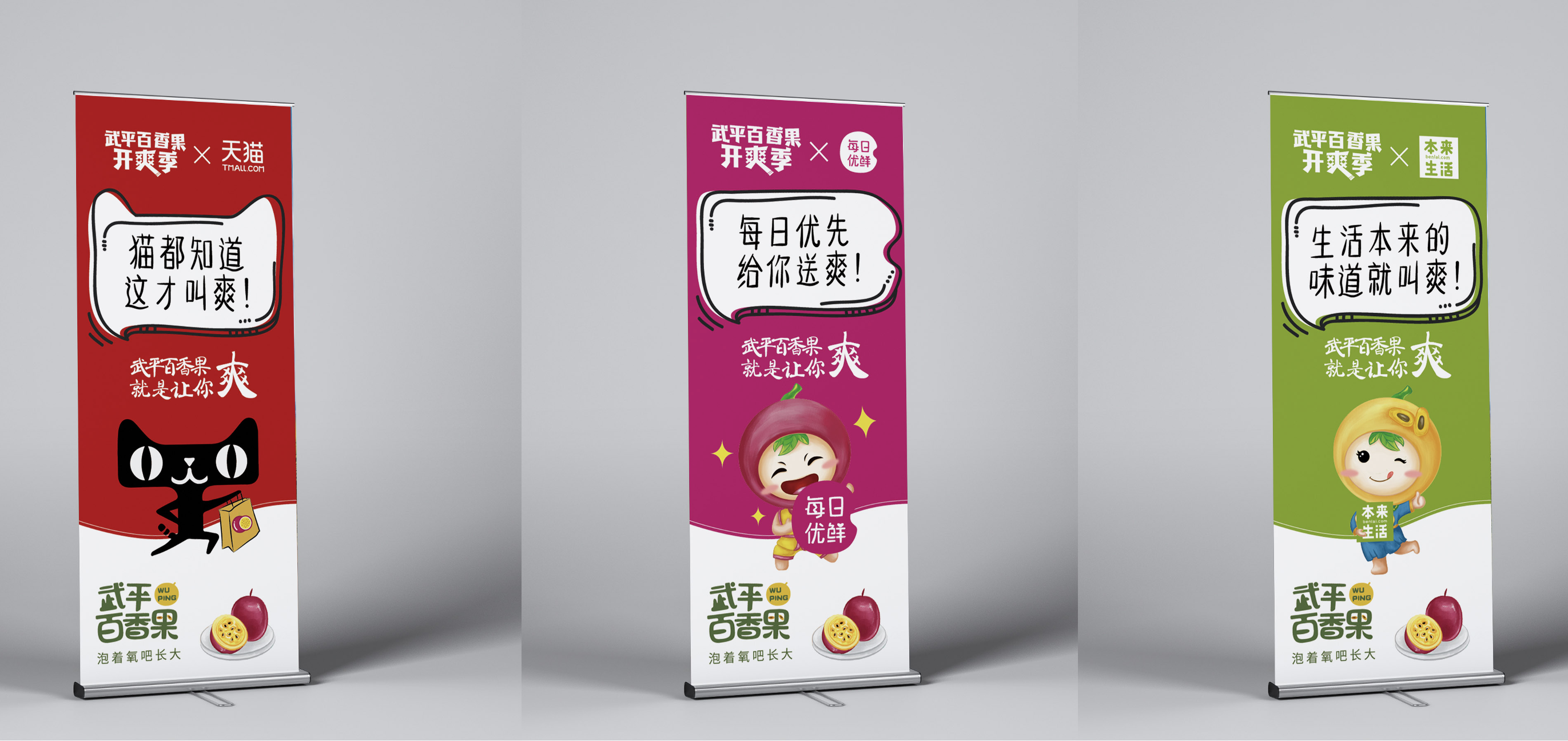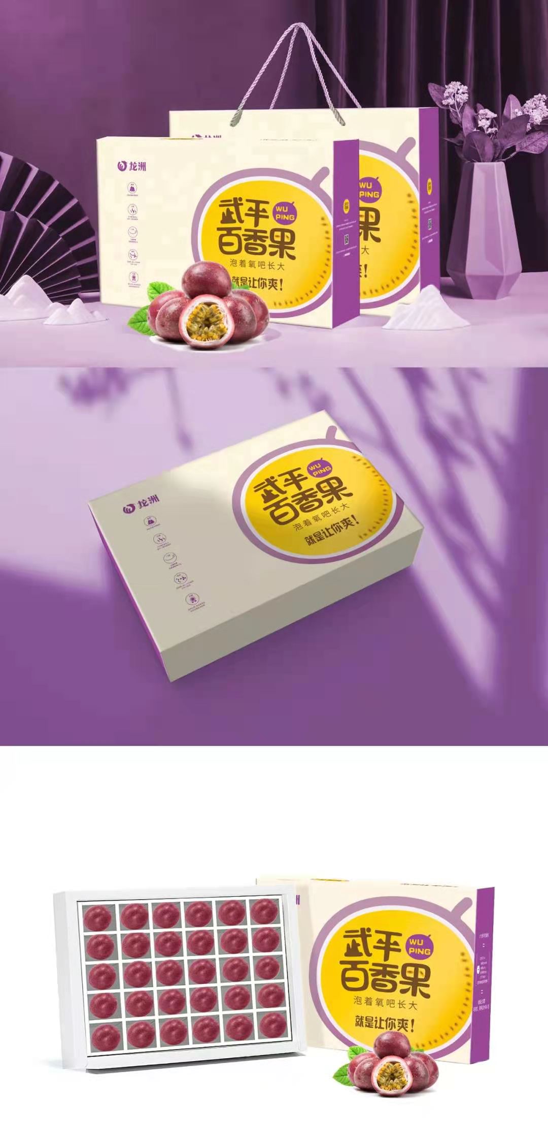 我們以百香果的果形為核心識別圖案,目的是增強(qiáng)品類感知,不斷強(qiáng)化“百香果=武平百香果”,