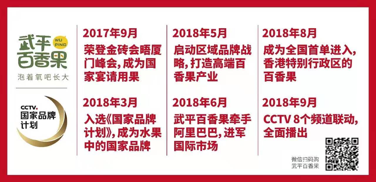 2018年9月,武平百香果品牌成功入選CCTV《國家品牌計(jì)劃》,央視免費(fèi)親拍親制廣告,在CCTV1套、CCTV2套、CCTV3套、CCTV4套、CCTV7套、CCTV8套、CCTV9套、CCTV13套共8個(gè)頻道展播,每天播出頻次不低于20次。這是國內(nèi)農(nóng)業(yè)區(qū)域公用品牌中,難得的榮耀,武平百香果迅速躋身成為百香果領(lǐng)域的國家隊(duì)!