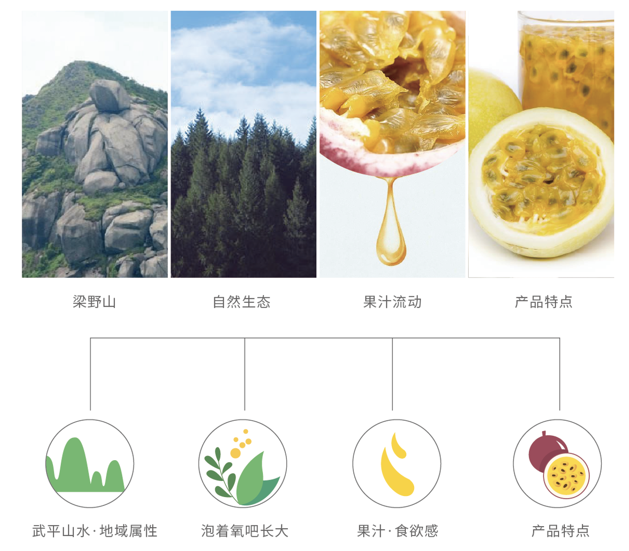 弘道公司把把武平百香果背后的“林改第一縣”的人文文化和“泡著氧吧長大”的品牌認(rèn)知植入到品牌符號的創(chuàng)意中,讓武平百香果的標(biāo)識體系中擁有她獨(dú)一無二且不可復(fù)制的區(qū)域靈魂與文化個(gè)性。