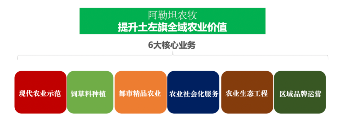 在完成阿勒坦品牌塑造的基礎上,考慮到阿勒坦公司旗下業(yè)務的復雜性,我們從未來的集團化企業(yè)的視角,依托阿勒坦國企背景的資源優(yōu)勢及其草業(yè)業(yè)務的優(yōu)勢性,共用非界面配稱資源,圍繞土左旗“全域農業(yè)價值提升的產業(yè)化集團”的企業(yè)定位,梳理規(guī)劃了“飼草料種植”、“現代農業(yè)示范”、“都市精品農業(yè)”、“社會化服務”、“農業(yè)生態(tài)工程”、“區(qū)域品牌運營”等6大業(yè)務模塊,打造集團化業(yè)務矩陣,此處不做詳解。
